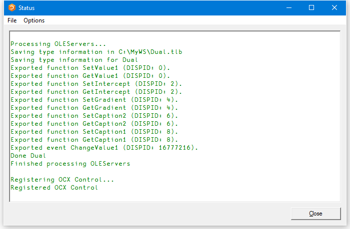 The ActiveX control we will use in this example is deliberately an extremely simple one; so that the intricacies of the control itself do not get in the way of the principles involved. In practice, there are actually very few restrictions concerning the complexity of the ActiveX control, and it is perfectly possible to package complete multiple-window Dyalog APL applications in this way.