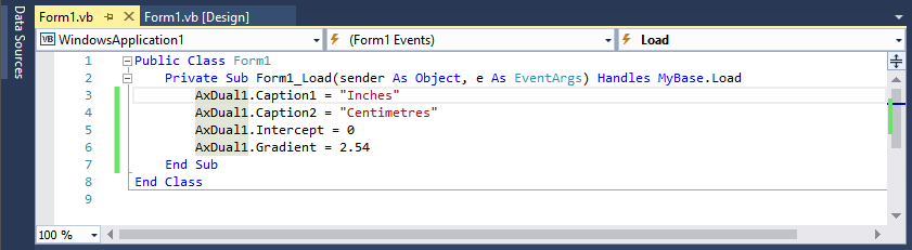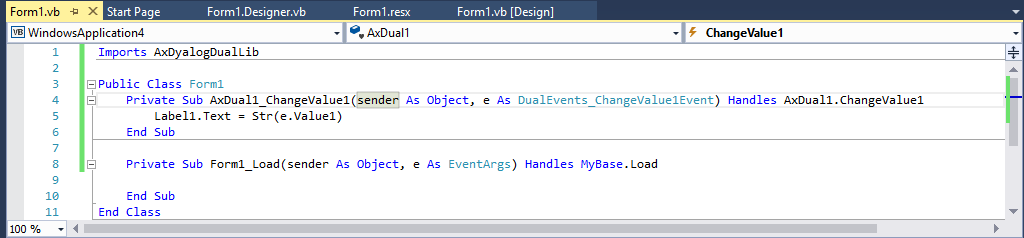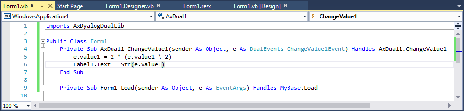 Start the application using Start Debugging. Exercise the Dual control and observe that VB updates the Label1 control in response to the ChangeValue1 events. When you have finished, select Stop Debugging.
