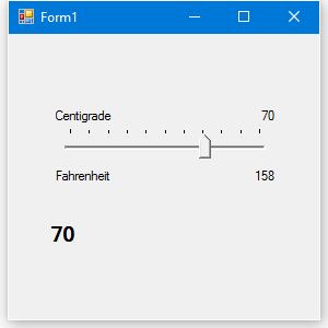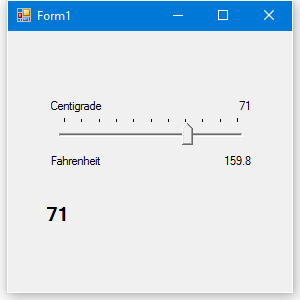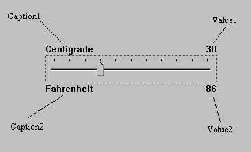 The Dual control allows the user to enter a number using a slider, whilst displaying its value in two different units. For example, you could use it to enter a temperature value which is displayed in both Centigrade and Fahrenheit units. Equally, the same control could be used to enter a measurement of length which is concurrently displayed in centimetres and inches.