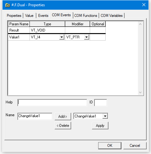 In the column labelled Param Name enter Value1, then change the Type to VT_I4 and the Modifier to VT_PTR. This defines a parameter named Value1 that supplies a pointer to an integer. The fact that it is a pointer means that the (integer) parameter may be modified by the host application.