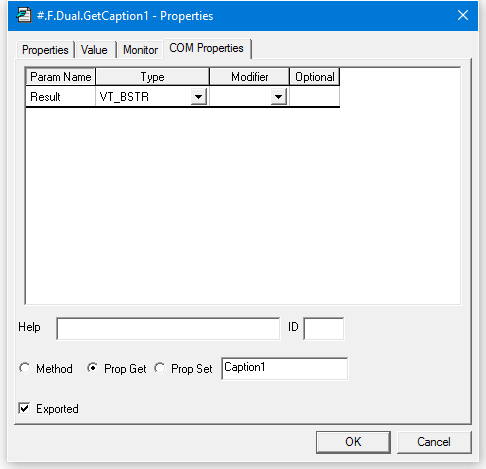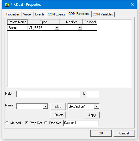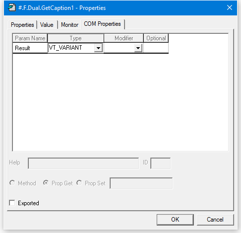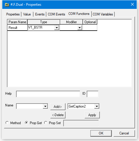 An alternative way to define the syntax for exported functions is to use the COM Functions tab in the Properties dialog box for the ActiveXControl object itself. (Hint: using the Workspace Explorer, open F so that its contents, Dual, are displayed in the right-hand list, select Dual, then click Props).