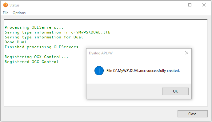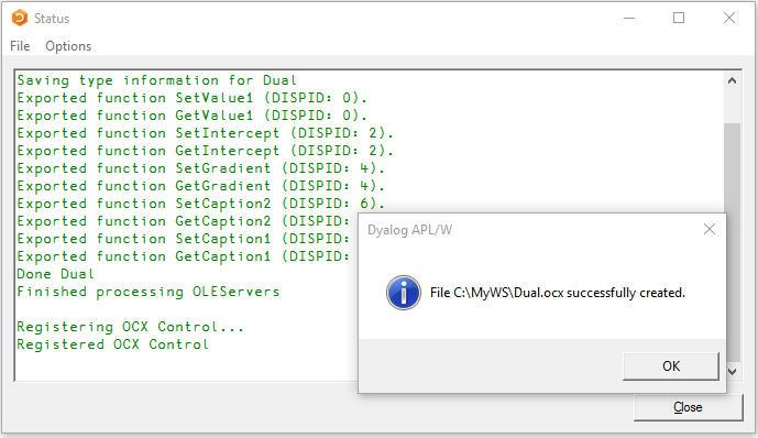 To save time, the basic APL code for the Dual control has already been written. Two workspaces are provided in the samples\activex subdirectory named dualbase.dws and dualfns.dws. You will use these workspaces to build the ActiveX control yourself.