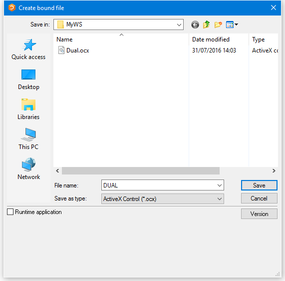 From the Session File menu, select Export, choose where you want to save your OCX, and then click Save. It is a good idea to clear the Runtime application checkbox so that you can debug the control if anything goes wrong.
