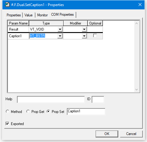 | SetCaption1 | VT_VOID | Caption1 | VT_BSTR | Put(4) | Caption1 |