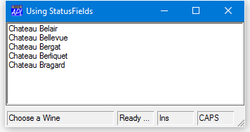 There are basically three ways of using StatusFields. Firstly, you can display information in them directly from your program by setting their Caption and/or Text properties. For example, if you are executing a lengthy calculation, you may wish to display the word "Calculating ..." as the Caption of a StatusField and, as the calculations proceed, display (say) "Phase 1" followed in due course by "Phase 2", and so forth. You can also use StatusFields to display application messages, including warning and error messages, where the use of a MsgBox is inappropriate.
