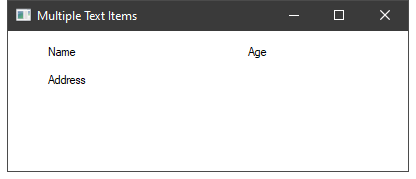 The capability to specify more than one graphical item as a single object is particularly useful with the Text object as it allows you to display or print several text items (at different positions and in different colours if you wish) in a single statement. For example, the following expressions display a set of "labels" in a Form 'F1':
