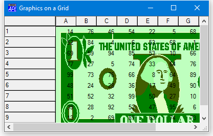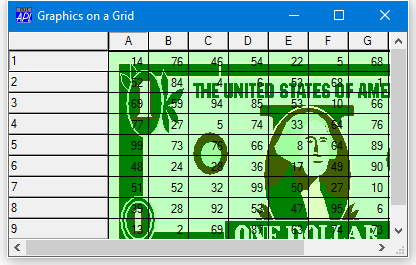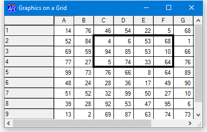 For the Grid (but only for the Grid) the Coord property may be set to 'Cell' as an alternative to 'Prop', 'Pixel' or 'User'. This allows you to easily position graphical objects relative to individual cells or ranges of cells. The origin of the Grid (0,0) is deemed to be the top left corner of the data (that is, the area inside the row and column titles). In Cell co-ordinates, the value (1,1) is therefore the bottom right corner of the first cell. Regardless of the coordinate system, graphical objects scroll with the data.