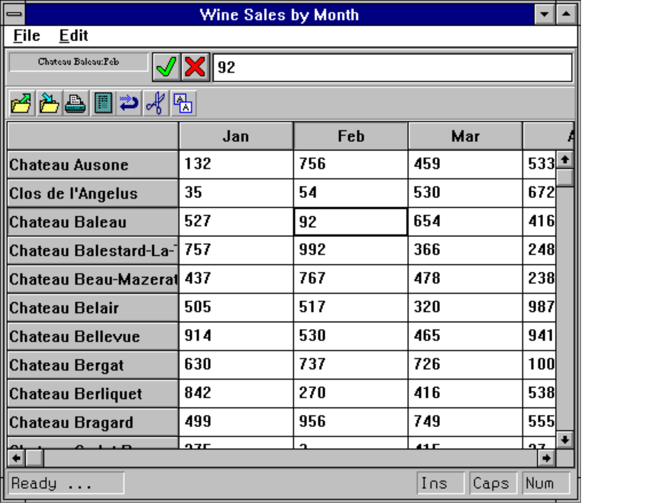 The Grid object allows you to display information in a series of rows and columns and lets the user input and change the data. The Grid has four main components; a matrix of cells that represents the data, a set of row titles, a set of column titles, and a pair of scroll bars. The following picture illustrates these components. The scroll bars scroll the data cells and either the row or column titles. The row titles remain fixed in place when the data cells scroll horizontally and the column titles stay fixed when the data is scrolled vertically.