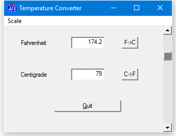 It would also be helpful if you could use the scrollbar to calculate in the reverse direction, from Fahrenheit to Centigrade. Let's add this facility, and give you the ability to choose to which scale the scrollbar applies through a menu.