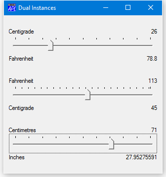 For example, function RUN creates a Form and 3 Instances of Dual; one to convert Centigrade to Fahrenheit, one to convert Fahrenheit to Centigrade, and the third to convert centimetres to inches.