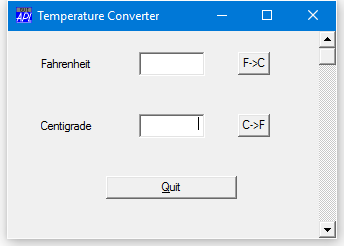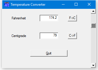 The range of a scrollbar goes from 1 to the value of the Range property. Setting Range to 101 will give us a range of 1-101. You will see in a moment why we need to do this. The Scroll event will be generated whenever the user moves the scrollbar. We have associated it with the callback function 'C2F' which we will define as follows: