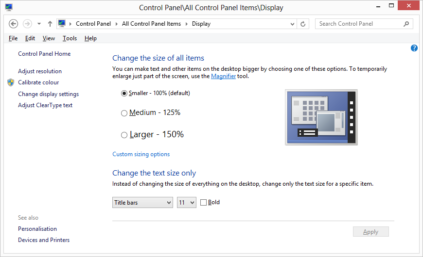 To address this issue, the Desktop Window Manager, which is enabled in Windows Vista and above, automatically scales up windows and their content to match the current DPI setting.