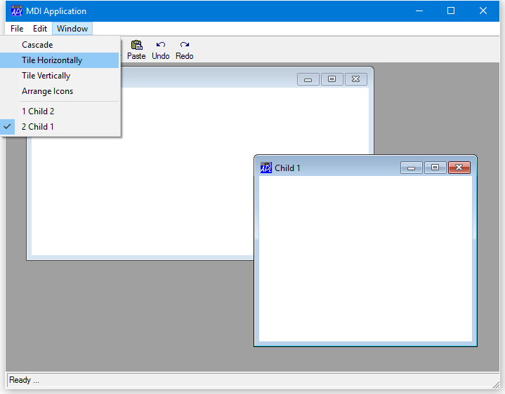 Most MDI applications incorporate a Window menu. This is a special menu that displays the captions of all open SubForms as shown below. The caption of the SubForm which currently has the focus is checked and the user can switch focus to another SubForm by selecting it from the Window menu.