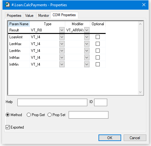 Right-click over the name CalcPayments and select Properties from the pop-up menu. This brings up the Properties dialog box for Loan.CalcPayments. Click on the COM Properties tab, check the Exported box and then fill in the names and data types of its parameters as illustrated below.