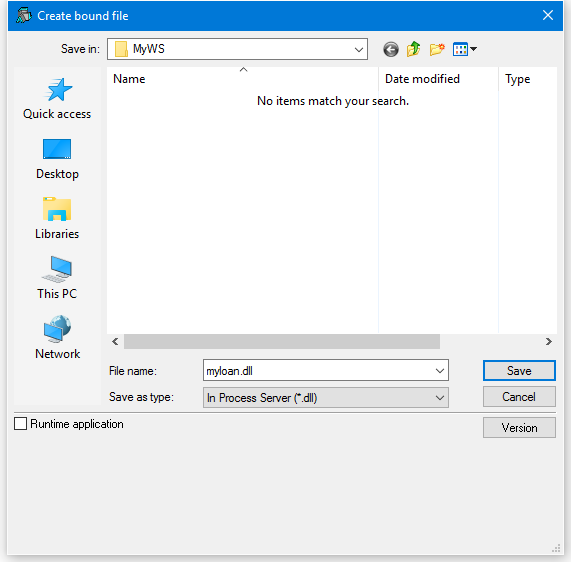 Finally, to create your OLE Server, choose Export from the Session File menu and complete the Create bound file dialog box as shown below. In this case, the OLE Server is created as an in-process server, bound to the development version of the Dyalog APL DLL (because the Runtime application checkbox is cleared)
