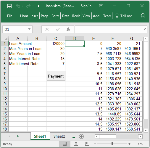 CalcPayments returns a matrix. The first row contains the period numbers (from min to max). The first column contains the interest rates (from min to max in steps of 0.5%). Other elements contain the monthly repayments for the corresponding number of periods and interest rates.
