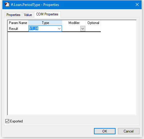 The picture above shows the COM properties to export variable PeriodType as a property. The property is declared to be of type VT_I4 (integer).