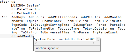 For example, in the example below, the mouse is hovered over the external function dt.AddMonths and shows that it requires a single integer as its argument.