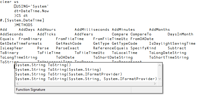 Should the external function provide more than one signature, they are all shown in the Value Tip as illustrated below. Here the function ToString has four different overloads.