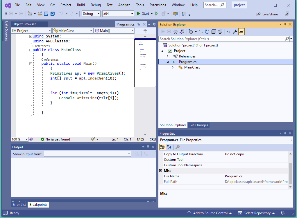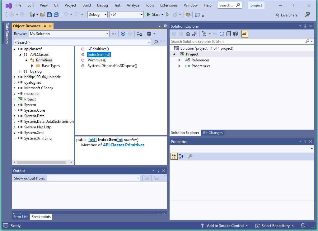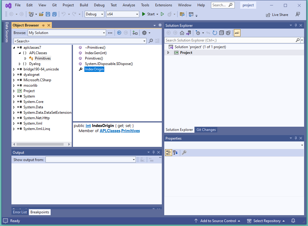 This shows that aplclasses7.dll contains a .NET namespace called APLClasses, which in turn contains the Primitives class. Primitives has a single method named IndexGen() which takes a number (an int) and a property named IndexOrigin.