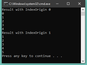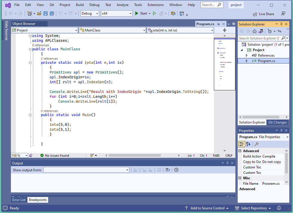 Next, Display the c# program program.cs. Notice that the main program calls a subroutine iota twice to calculate ⍸5 in origin 0 and 1.