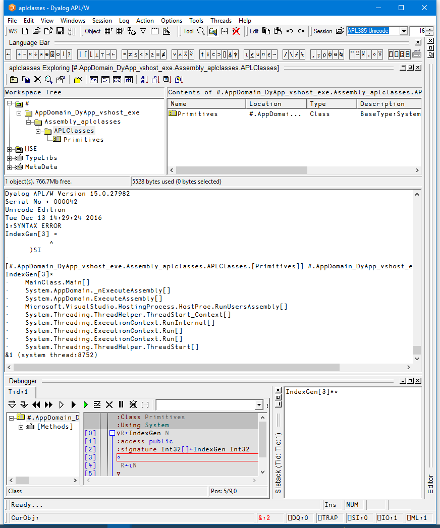 Notice that the state indicator displays the entire .NET calling structure, and not just the APL stack. In this case, the state indicator shows that IndexGen was called from MainClass.Main, which combines the class and method names specified in aplfns.cs. Note that .NET calls are slightly indented.