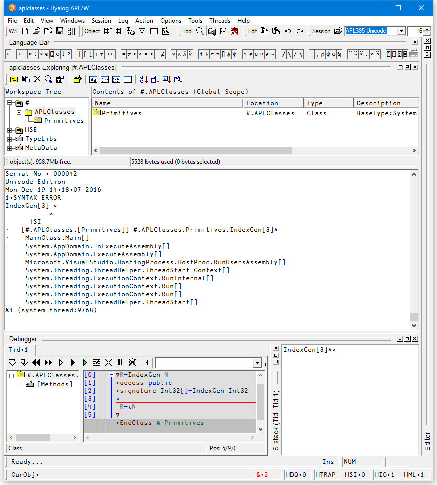 The following picture shows the namespace tree that exists in the Dyalog DLL workspace when the first example (see Example 1) in the chapter Writing .Net Classes is executed under Visual Studio. However, to cause the suspension, an error has been introduced in the method IndexGen.