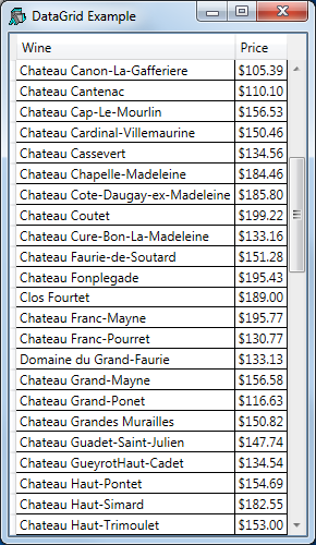 Similarly, Binding="{Binding Price, StringFormat=C}" specifies that the Path for the second column is Price (the phrase StringFormat=C merely specifies the default currency format).