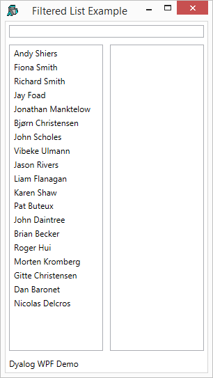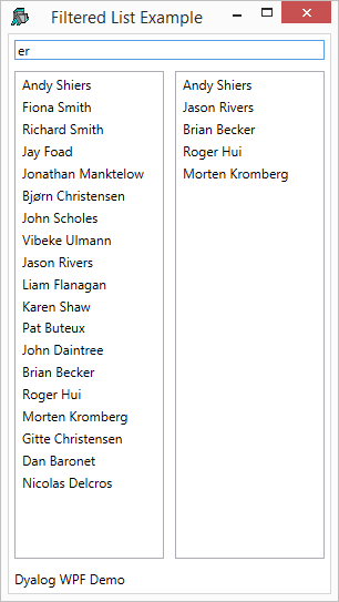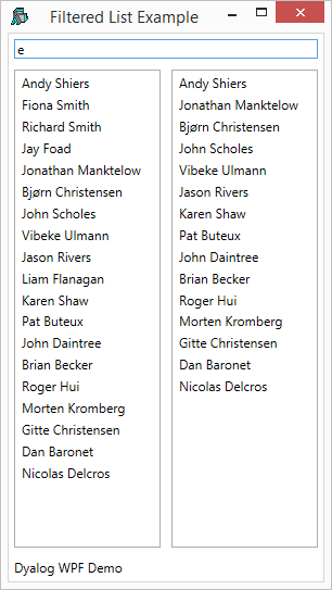 When the callback runs, the variable MySource.Filter, which is bound to the Text property of the TextBox, will contain "e". The function calculates a mask hits which identifies which members of the variable DyalogNames contain this string. It then assigns that subset to the variable MySource.FilteredList. This is bound to the ItemsSource property of the right-hand ListBox, so the result is as follows: