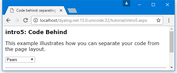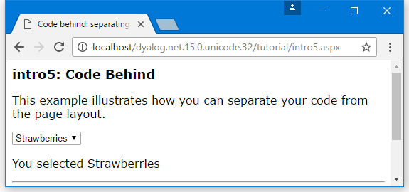 The name of the class, in this case FruitSelection, must be the same name as is referenced in the .aspx web page file itself (intro5.aspx). The base class must be System.Web.UI.Page