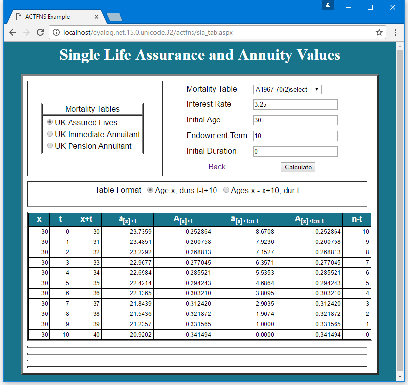 When you choose the first option, the system loads sla_tab.aspx. This defines the screen layout in terms of ASP.NET controls, including the DataGrid control for tabulating the results. The sla_tab.aspx script contains the declarations Inherits="actuarial" src="actfns.dws", so ASP.NET loads the actuarial class from this workspace (via a call to Dyalog APL). When the page is loaded, it generates a Page_Load event, which in turn calls its Page_Load method. This populates the ASP controls with data, and the resulting web page is displayed. The mechanism is described below.