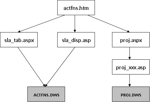 The diagram above illustrates the structure of the web application and the various files involved. The starting page, actfns.htm, simply provides a menu of choices which link to various .aspx web pages. These pages in turn are linked to one of the two workspaces via the src="" declaration