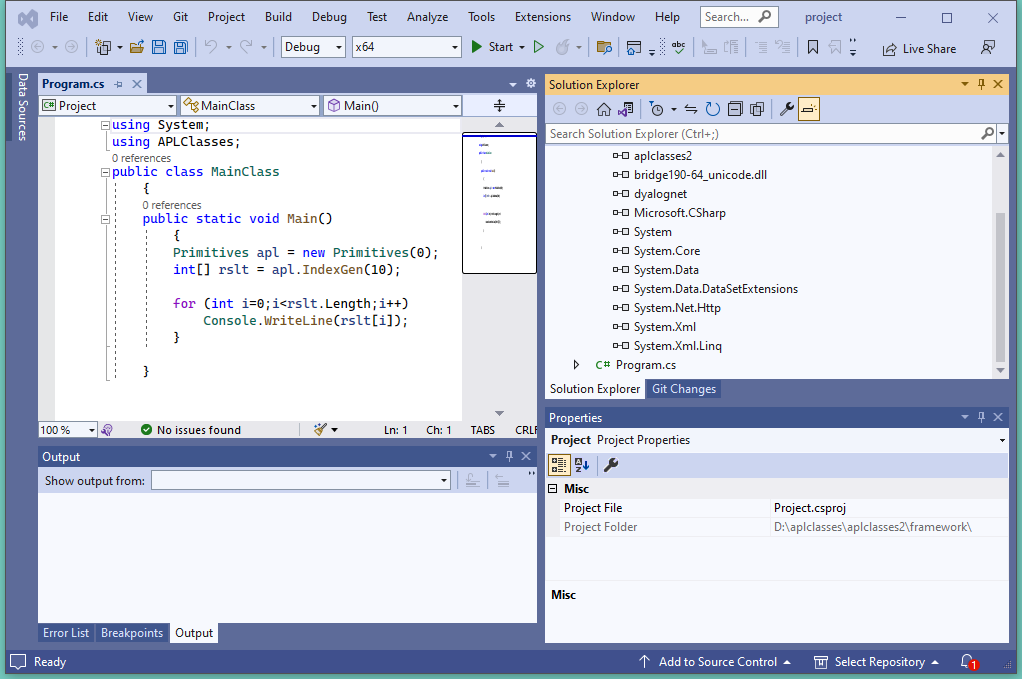 The following C# source, called aplclasses2\Framework\program.cs, will be used to call the new version of our Dyalog.NET class.