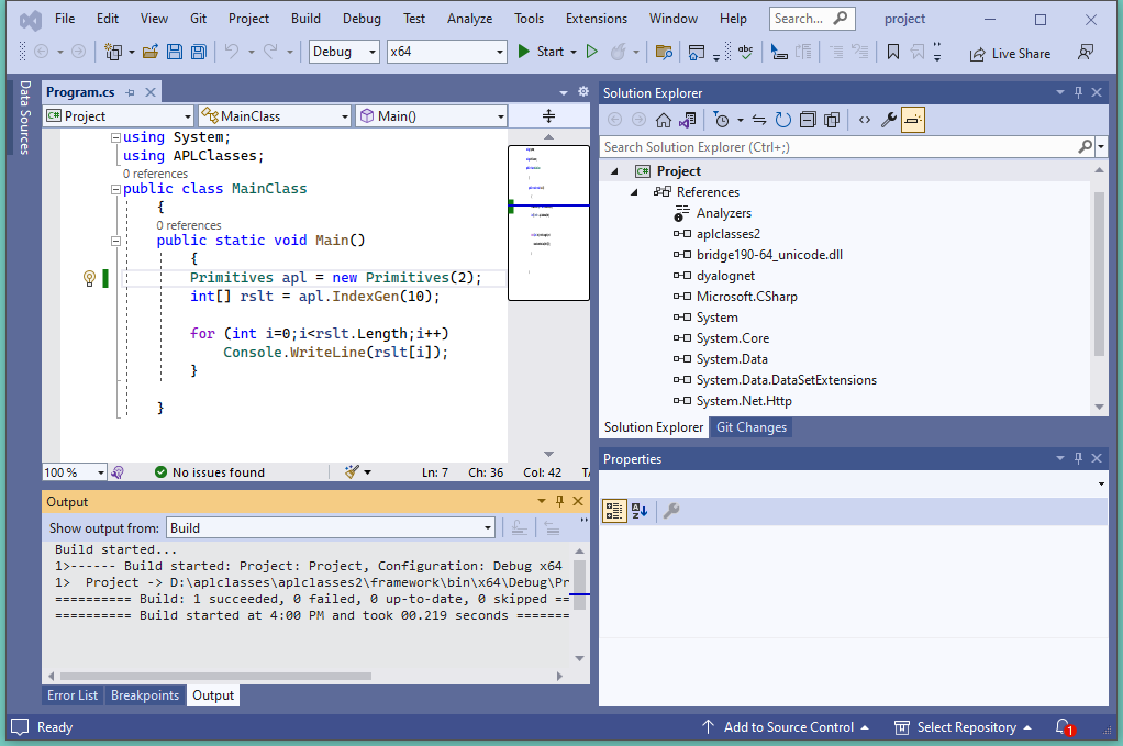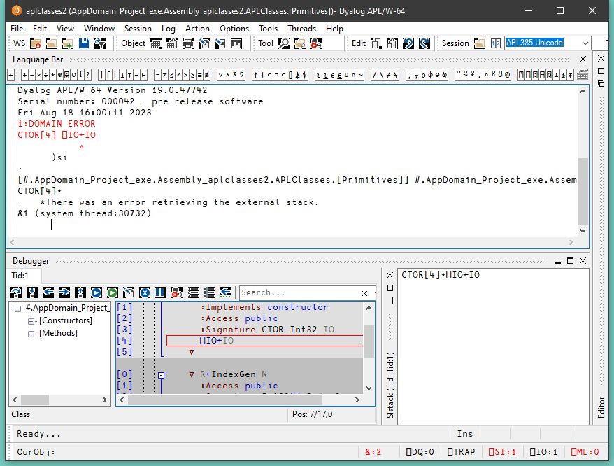 … as we have built the Dyalog .NET class to use the Development DLL, the APL Session appears, and the Tracer can be used to debug the problem. You can see that the constructor CTOR has stopped with a DOMAIN ERROR. Meanwhile, the C# program is still waiting for the call (to create an instance of Primitives) to finish.