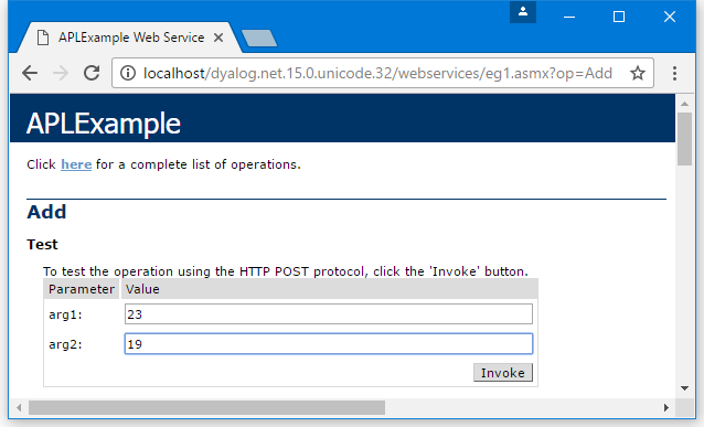 The following screen shot shows the result of entering the values 23 and 19 into the form fields and then pressing the Invoke button.