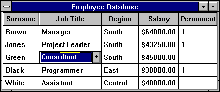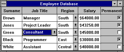 The example below illustrates the appearance of a Grid in which ShowInput is set to 0 for the Job Title column and 1 for the Region and Permanent columns.
