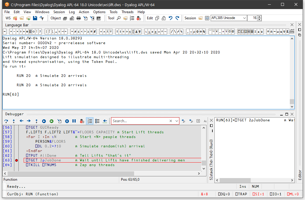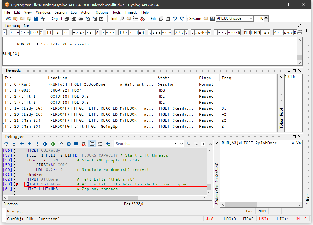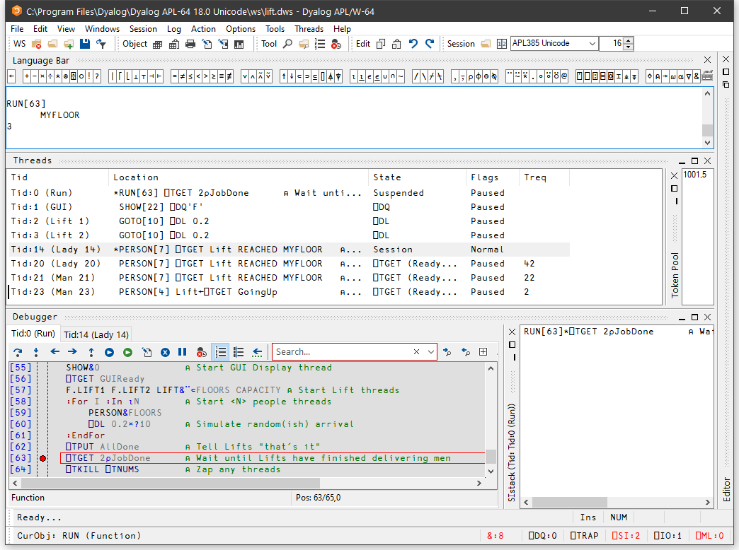You can use the Tabs to switch between the suspended threads, so clicking the Tab labelled 0:Run causes the display to change to the picture shown below. The Session is now connected to Thread 0 (Run), so the value of ⎕LC is 63.