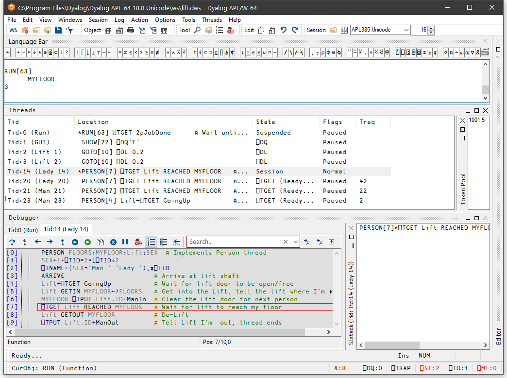 Note also that the Session window is connected to the thread indicated by the selected Tab. In this case, typing MYFLOOR into the Session window displays the value of the local variable MYFLOOR in Thread 14 (Lady 14).