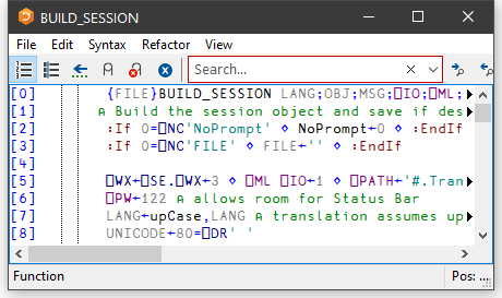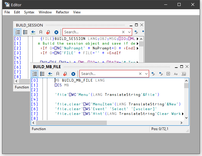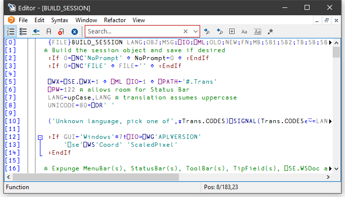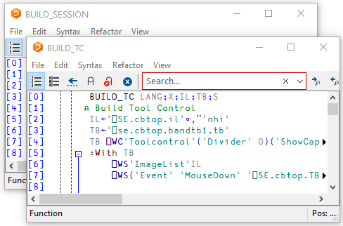 Unless Classic Dyalog mode is selected (Options/Configure/Trace/Edit), the Editor is a Multiple Document Interface (MDI) window that may be a stand-alone window, or be docked in the Session window. Each of the objects being edited is displayed in a separate sub-window. Individual edit windows are managed using standard MDI facilities.