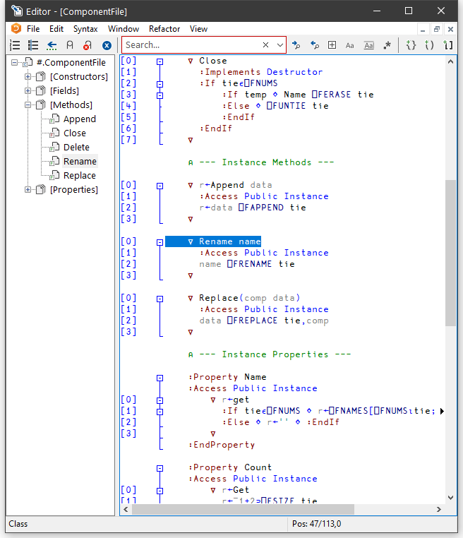 When you edit a class, a separate treeview is optionally displayed in the left pane to make it easy to navigate within the class. When you click on a name in the treeview, the editor automatically scrolls the appropriate section into view (if necessary) and positions the edit cursor at its start. The picture below illustrates the result of opening the [Methods] section and then clicking on Rename.