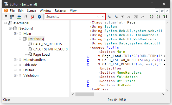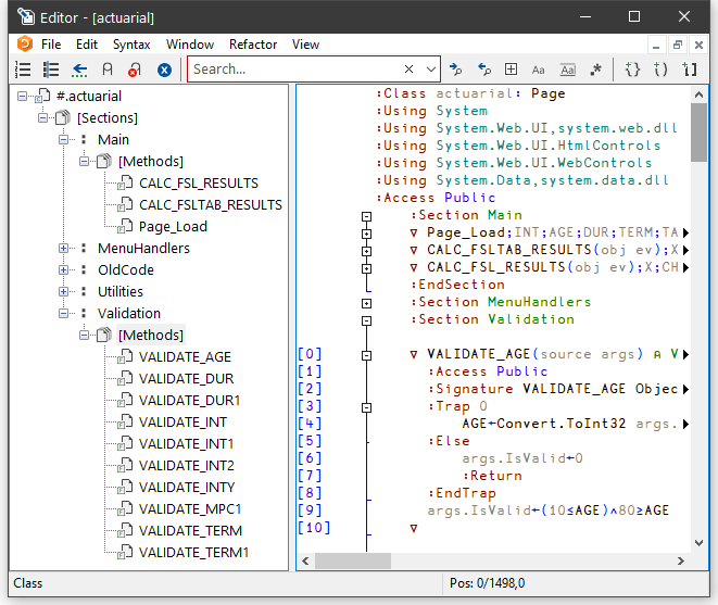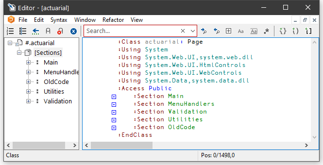 The following picture illustrates a Class named actuarial which, for editing purposes, has been sub-divided into five separate Sections named Main, MenuHandlers, Validation, Utilities and OldCode. In this picture, all the Sections are closed.