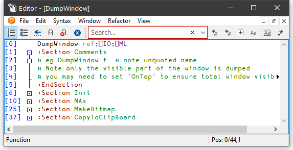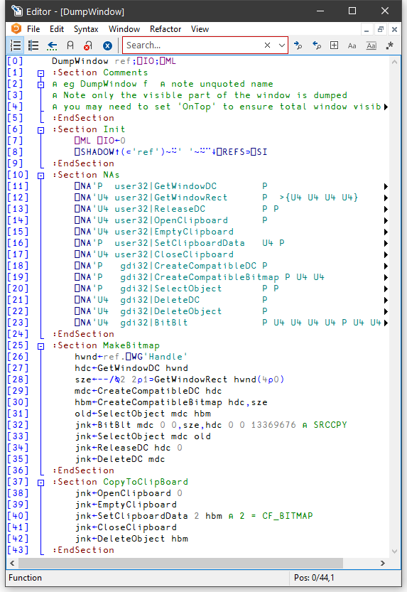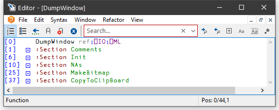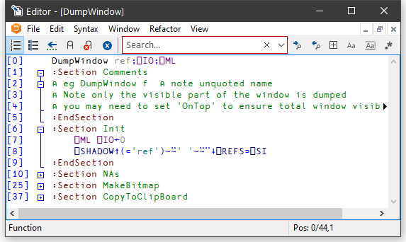 The following picture illustrates the use of sections in a function called DumpWindow. The function is divided into 5 sections named Comments, Init, NAs, MakeBitmap and CopyToClipBoard.
