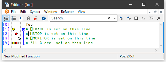 If any of the Stop, Trace, and Monitor options of the View menu are set, the Editor displays an area to the left of the function body containing up to 3 columns. If a function line is enabled by ⎕TRACE,⎕STOP or ⎕MONITOR the corresponding column displays a yellow circle (trace), red circle (stop) or clock symbol (monitor).