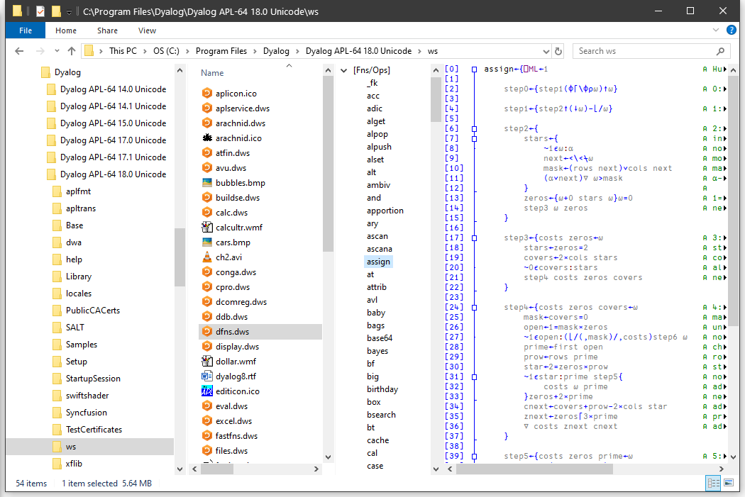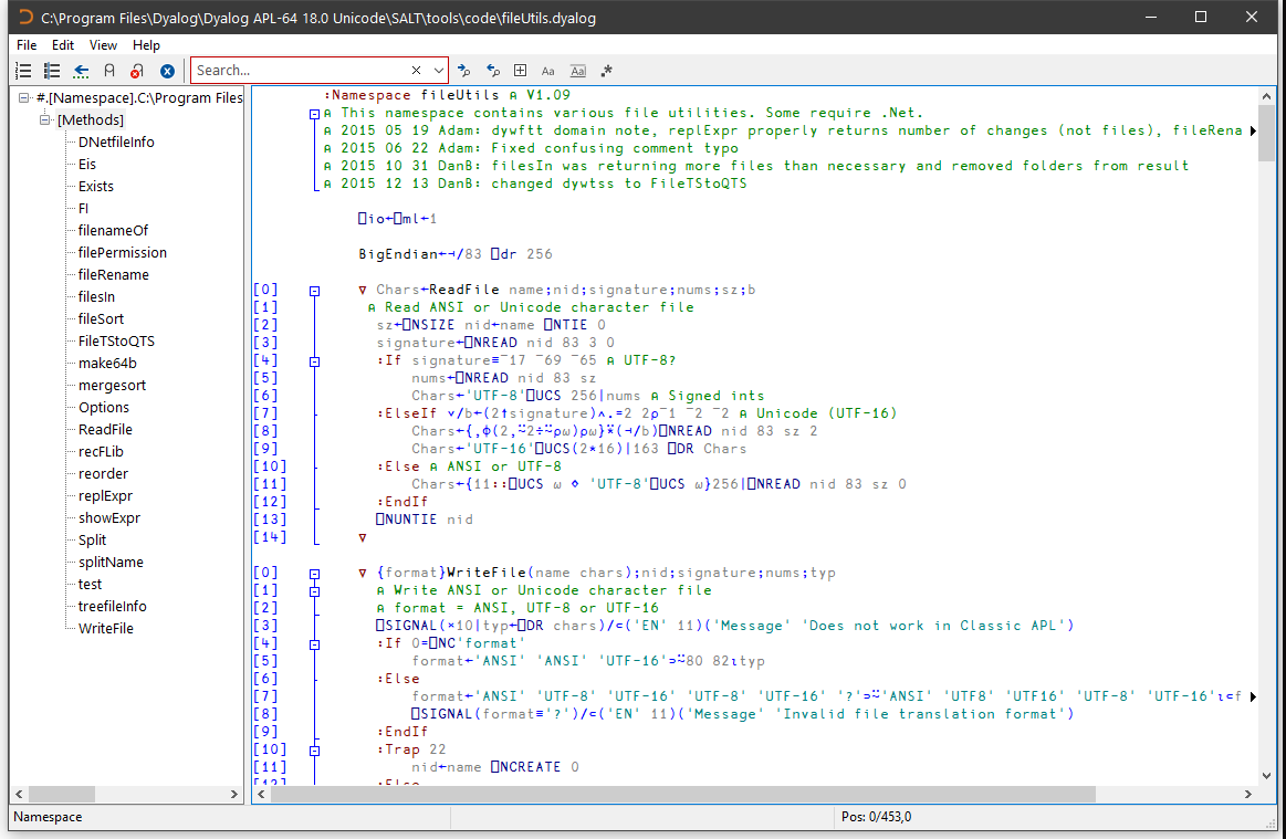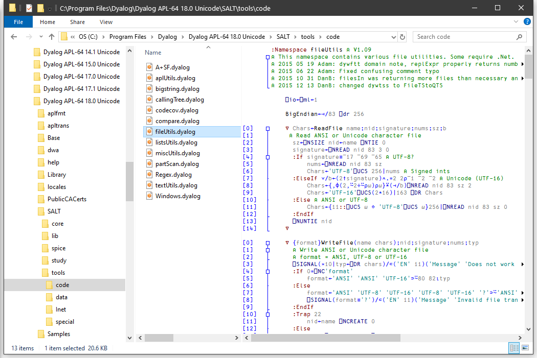 You can also browse Dyalog source files. The following picture shows what you see when you select the fileUtils.dyalog file.