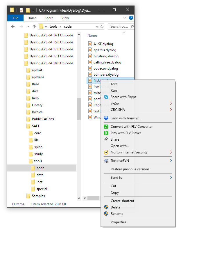 In addition, two items are added to the Windows Explorer context menu for directories, namely Load with Dyalog and Run with Dyalog. Both these items start Dyalog and attempt to import code from the corresponding directory using Link. The Run with Dyalog option also calls the function named Run if it exists. See Load Parameter.