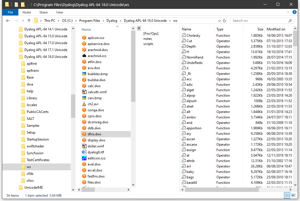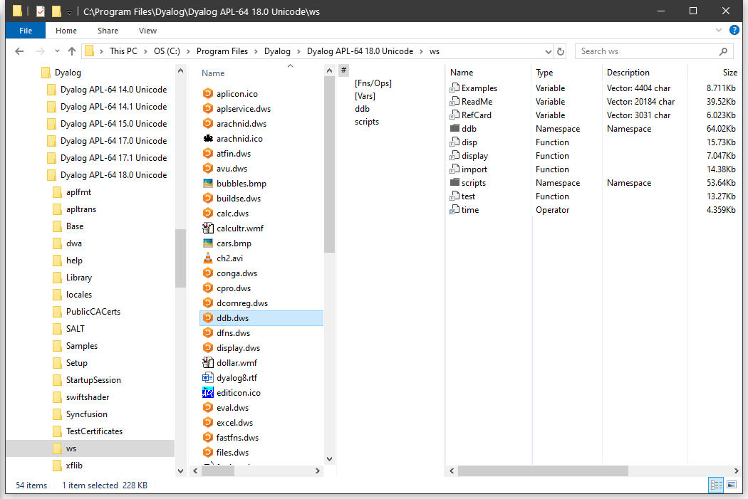 You can browse the contents of workspaces and Dyalog source files using the preview pane of Windows File Explorer. The following example show what you see in the preview pane when you select the supplied workspace ddb.dws.