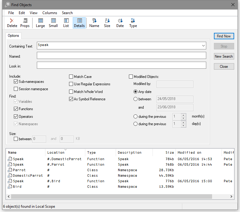 When you press the Find Now button, the system searches for objects that satisfy all of the criteria that you have specified on all 3 pages of the dialog box and displays them in a ListView. The example below illustrates the result of searching the workspace for all objects containing references to the symbol Speak.