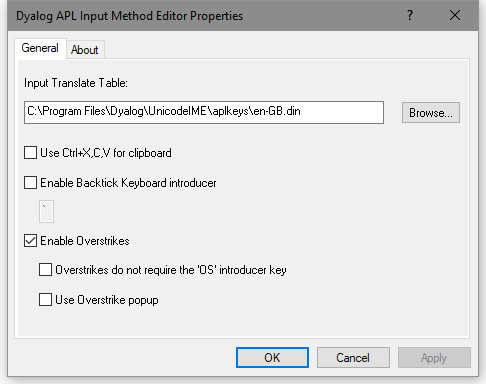 The translate table defines the mapping between APL characters and the keystrokes that generate those APL characters. It is possible to alter the mapping or to create support for new keyboards by altering the translate table, or by selecting a different translate table. See the IME User Guide for more details.