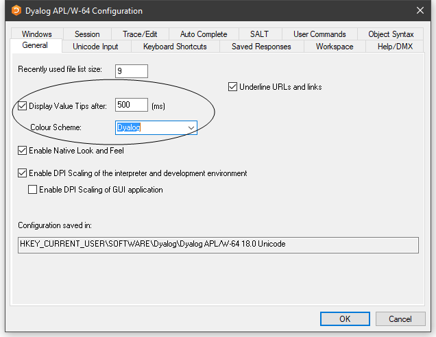 You may enable/disable Value Tips and select other options from the General tab of the Configuration dialog box as shown below.