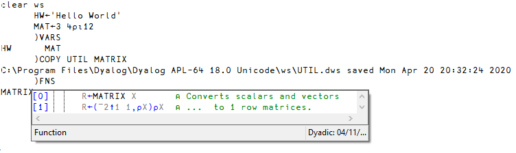 If you hover the mouse pointer over a name in the Session or Debugger window, APL will display a pop-up window containing the value of the symbol under the mouse pointer.